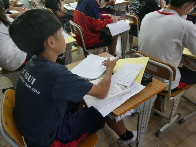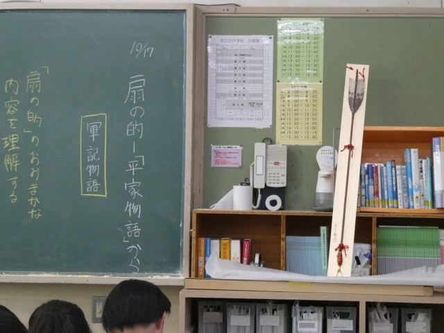 「扇の的」を題材に古文の学習を行っています。教室には、作品の中に出てくる鏑矢が置かれていました。実物を見ることで、場面を想像しやすくなり、読みも深まります。実物の力って、すごいですね。