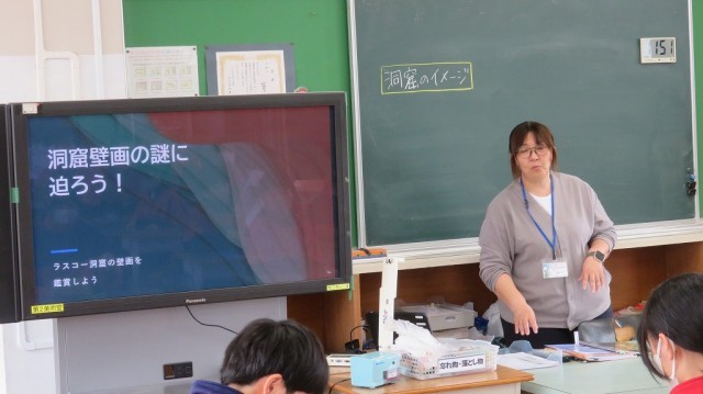 1年生では、洞窟の壁画について鑑賞をしました。社会科の授業でも学習した「ラスコー洞窟」に描かれている壁画は、なぜ描かれたのかを研究者になったつもりで考えました。まずは個で考えましたが、班ごとに伝え合ったり、学級全体で聞いたりしました。他者の考えに触れることで、自分の考えを深められたようです。これからも、さまざまな視点で作品を見ていけるといいですね。