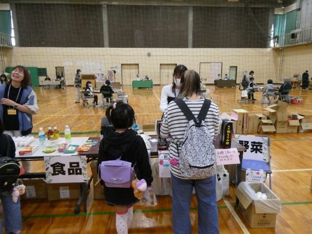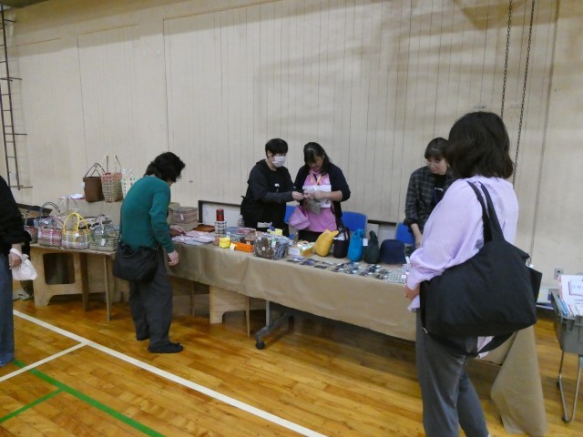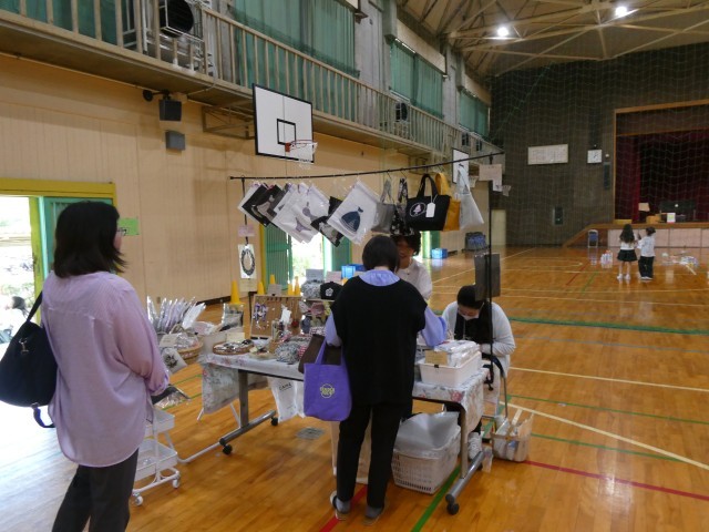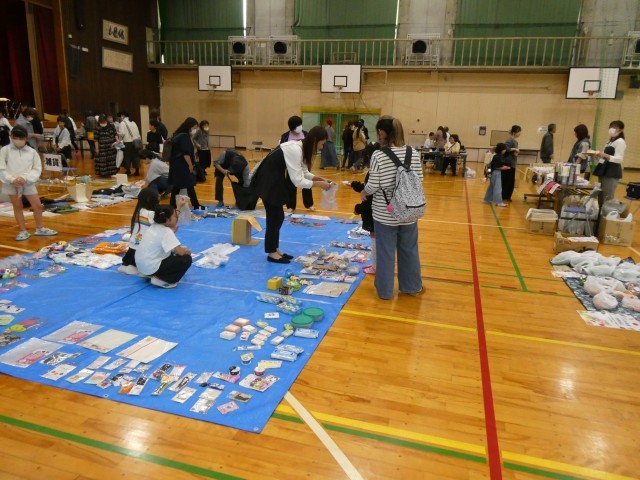 今日は、PTA主催のバザー・マルシェが体育館で開かれました。地域や保護者の方が多く参加し、賑わっていました。