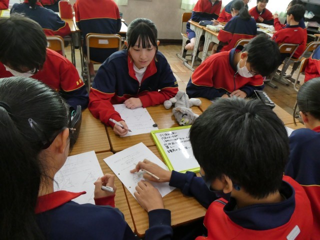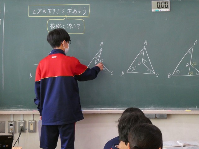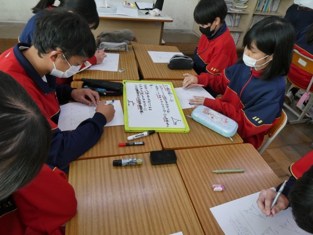 グループ活動では、それぞれが図形の性質をまとめ、それを手がかりにして角度が何度になるのかを考えました。角度の求め方にも、いろいろな考え方があり、友達の考えを聞いて参考にしたり、新たな考えを発見したりしていました。