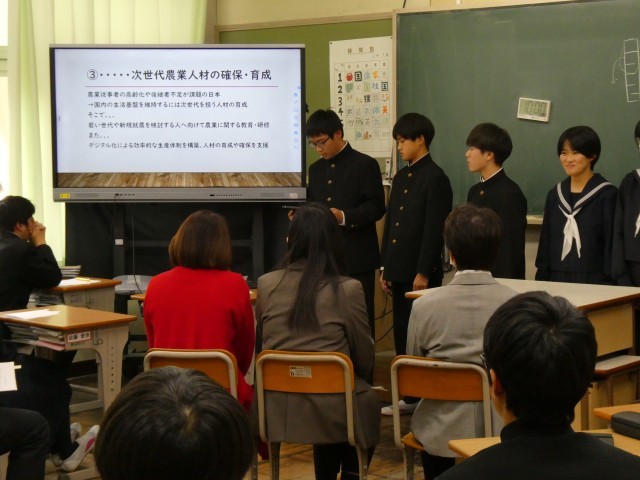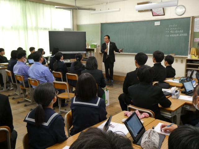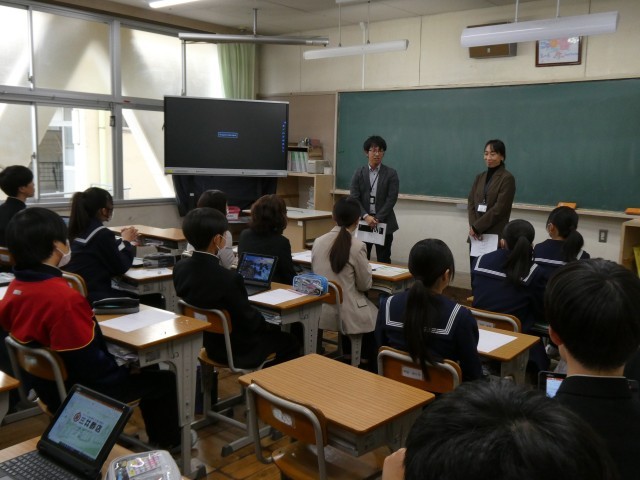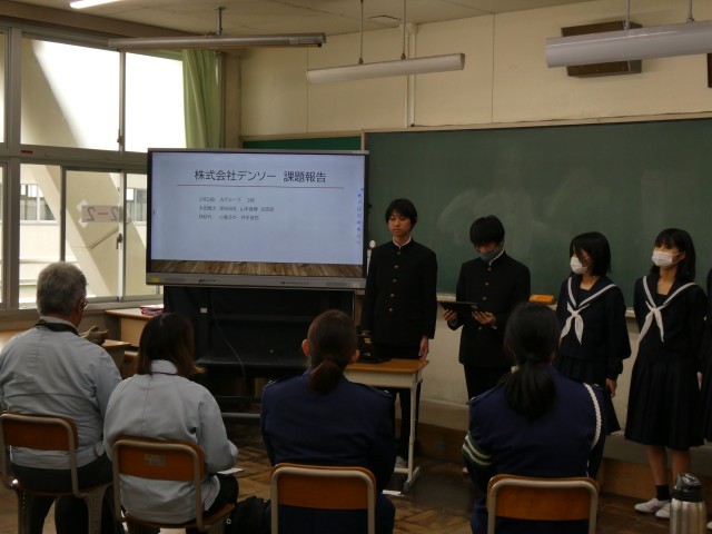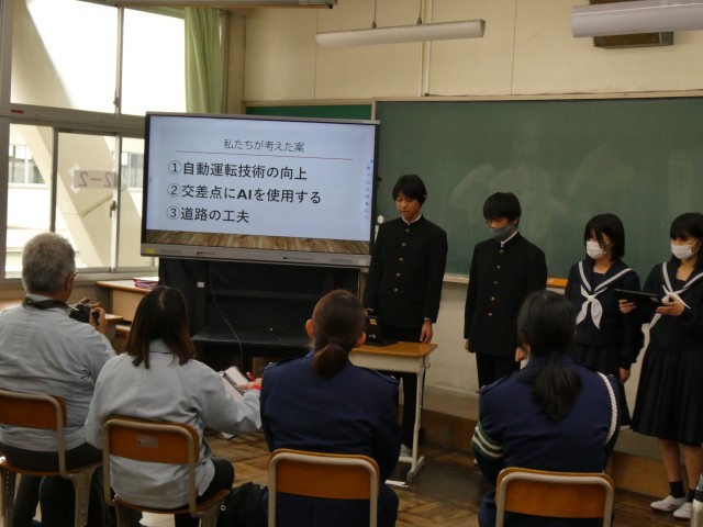 1学期に行った職業講話の際に、地元の各企業・団体の方からいただいた課題について、グループごとに考えた自分達なりの解決策や提案を発表をしました。どのグループもプレゼンテーションソフトを用いて、中学生ならではの柔軟な発想で考えを発表していました。