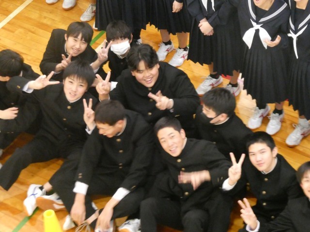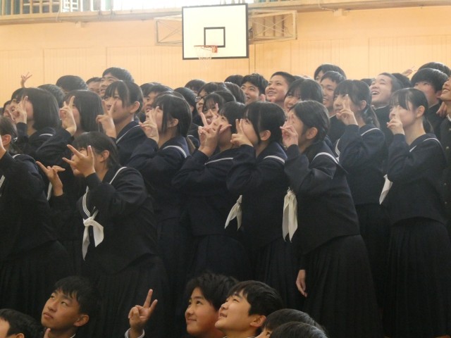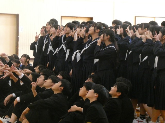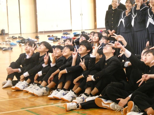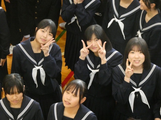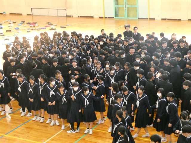 中学校生活最後の定期テストが終わった後、3年生は体育館に集まって学年写真を撮影しました。卒業アルバムの中に掲載される写真です。カメラマンの掛け声に合わせて笑顔で写真の収まっていました。中学校生活のよい思い出となってくれることを願います。