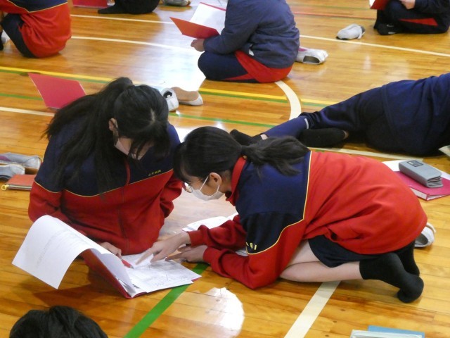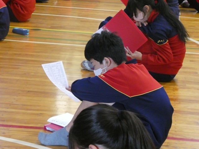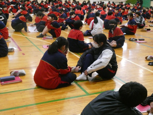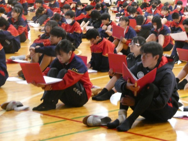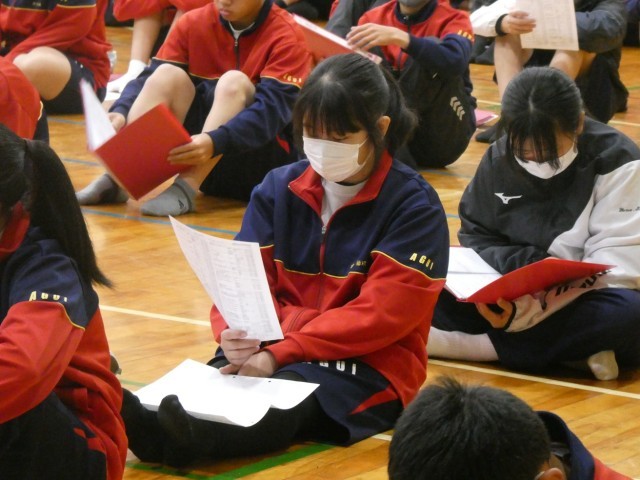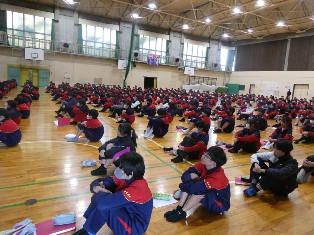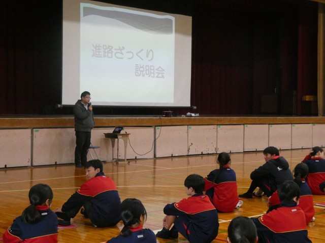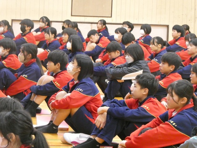 6時間目に、2年生は体育館で進路についての学習を行いました。中学校卒業後の進路選択に向けて、これから考えていくことや大切にすべきことなどの話を聞きました。途中、友達と資料を確認しながら、学習を深めました。来年の今頃は、受験校の決定などの選択を迫られます。その時のためにも、今日学んだことを生かしていってほしいものです。そして、一人一人の希望が叶うことを願っています。