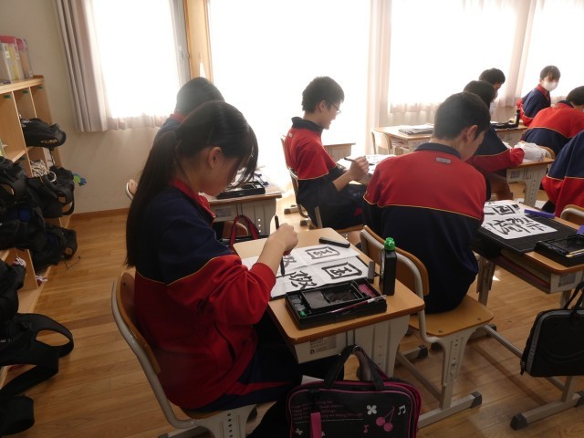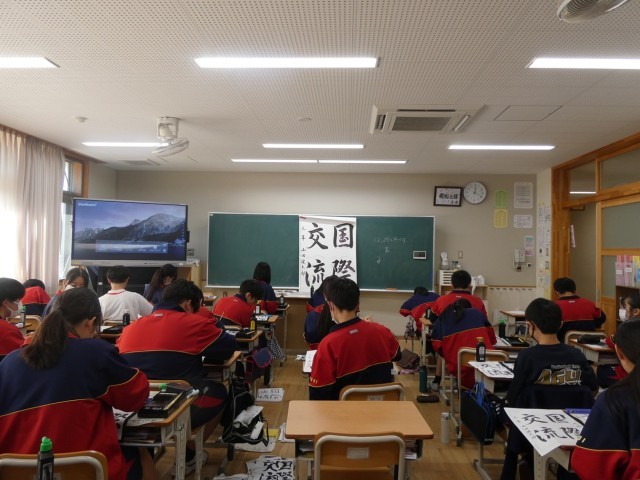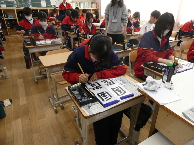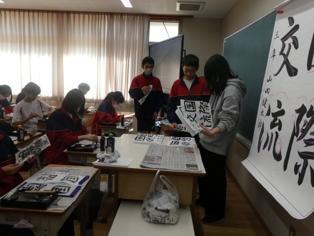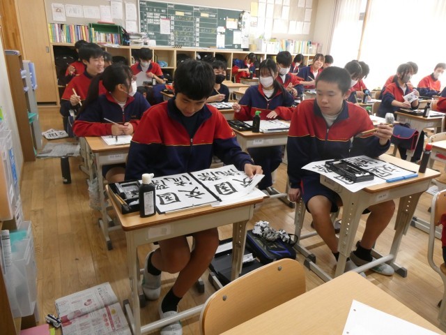 今、学校では、どの学年も書写作品コンクールに取り組んでいます。毛筆で、学年ごとの課題に取り組みます。3年生の課題は「国際交流」です。バランスのとり方や筆運びなどを工夫しながら、お手本を見て取り組んでいます。出来上がった作品の出来栄えを確認し、先生に提出します。一筆一筆集中して取り組む姿は、いいものですね。