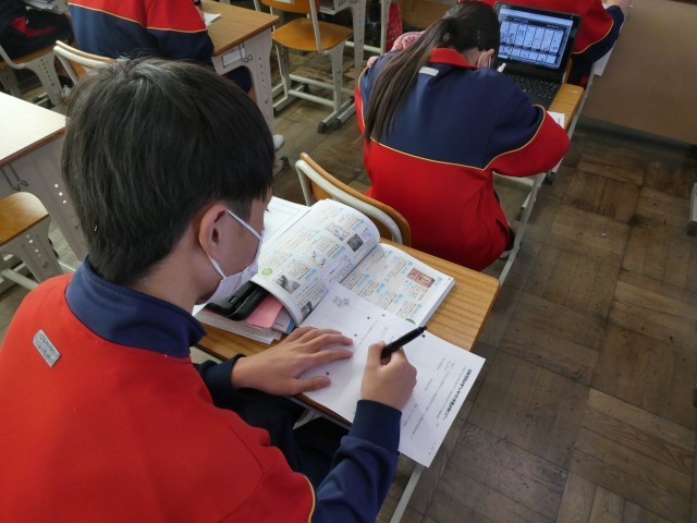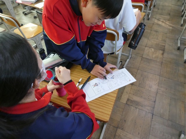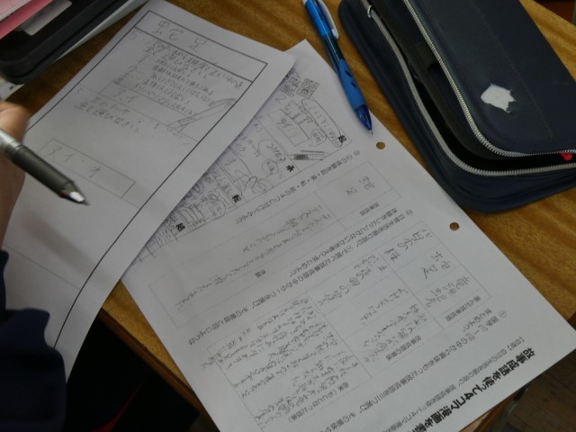 1年生の国語の授業では、故事成語の学習をしていました。授業で学習した言葉や調べ学習で調べた言葉から一つの故事成語を選び、その意味を自身の体験を踏まえて4コマまんがで説明をしていました。自身の体験を踏まえるということで、故事成語の意味と自分のこれまでの経験を振り返り、分かりやすく伝わるよう4コマの構成を考えていました。