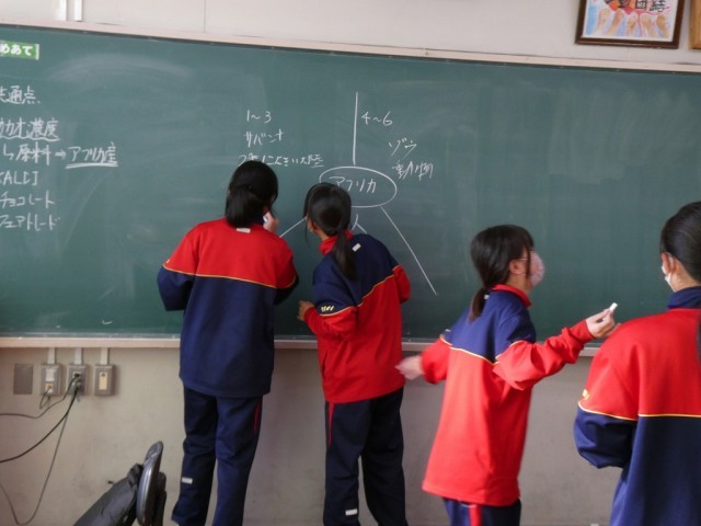 1年生は社会科地理分野の学習で、アフリカ州について学習しています。今日は三つのお菓子から共通点を見つけていきました。グループで話し合う中で、原材料に目を付け、どのお菓子もアフリカ産のカカオを使用していることに気付き、全体で共有しました。また、アフリカについて知っていることをペンリレーで伝え合いました。一人では思いつかないことも、仲間と協力することでさまざまな見方をすることができました。遠いようで身近なアフリカの学習が始まりました。身近なアフリカを探してみましょう!