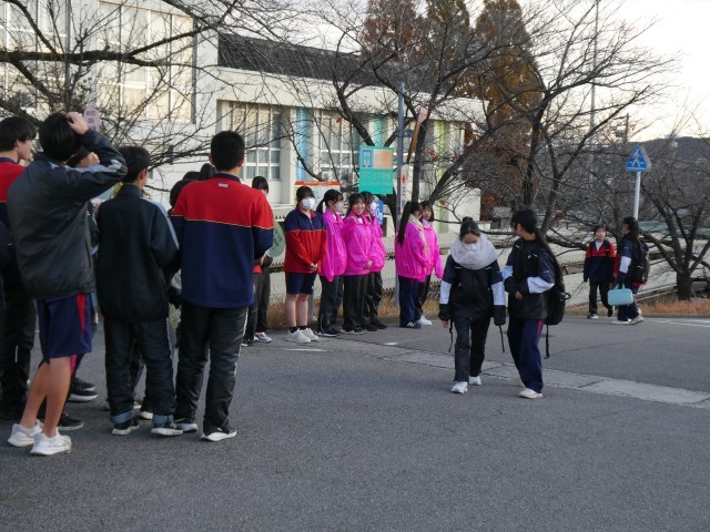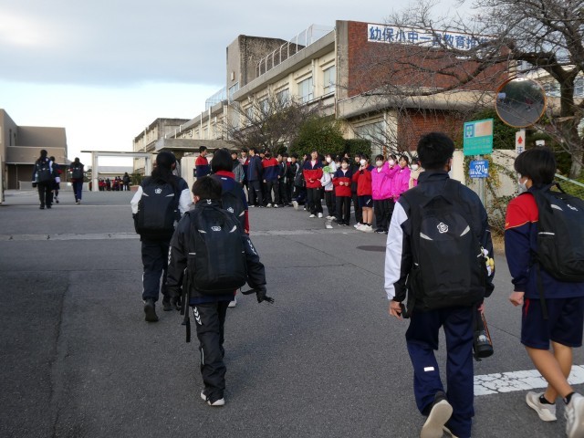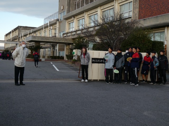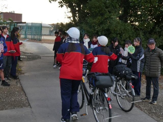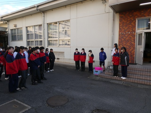 今日は、半田警察署の方や少年補導委員のみなさんが来校し、あいさつ運動を実施してくださいました。生徒役員やボランティアで多くの生徒も参加し、元気よく朝のあいさつを行いました。寒い朝でしたが、元気なあいさつで暖かな気持ちになりました。