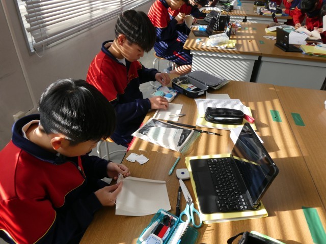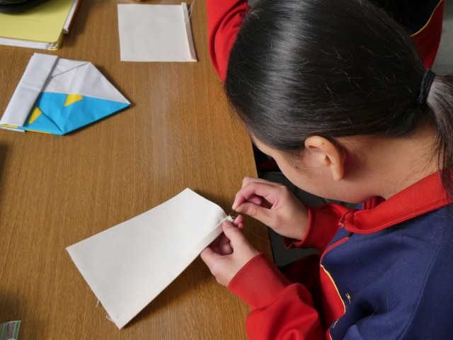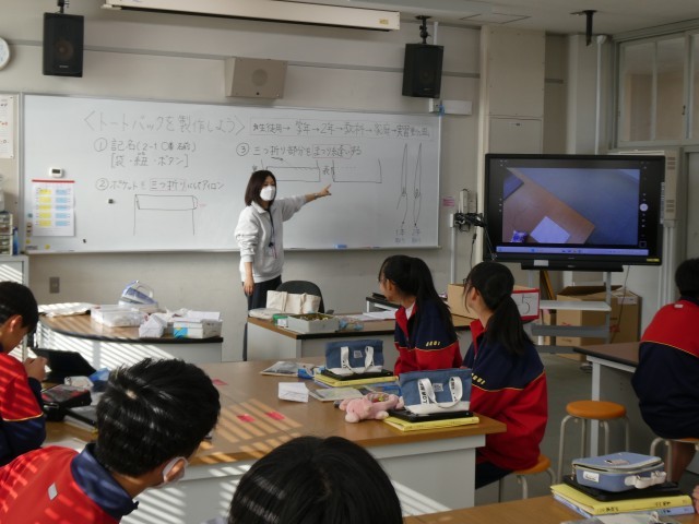 2年生の家庭科の授業では、裁縫を行っていました。これから、トートバックを製作していくようです。今日は、ポケットの一部分をまつり縫いする作業でした。
