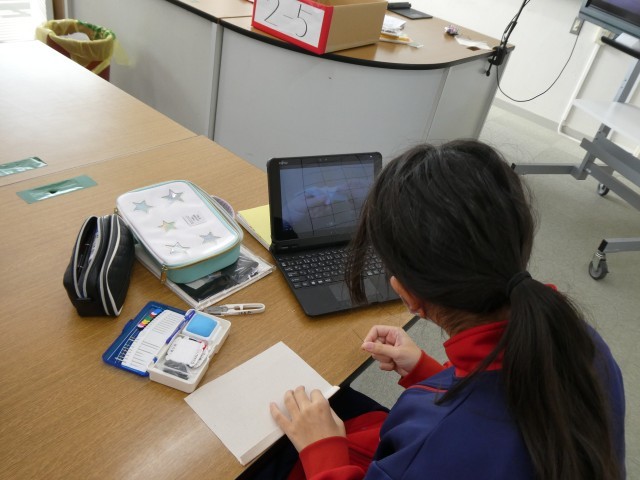 まつり縫いの仕方を確認し、実際に縫ってみました。分からないところは、タブレット端末の縫い方の動画を確認したり、先生や友達にたずねたりしながら縫っていました。