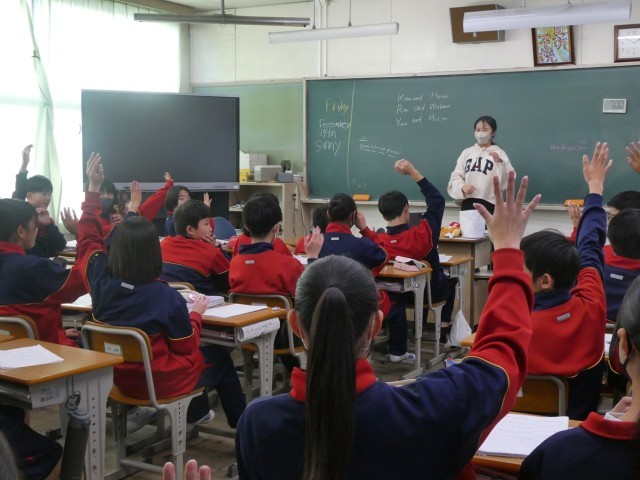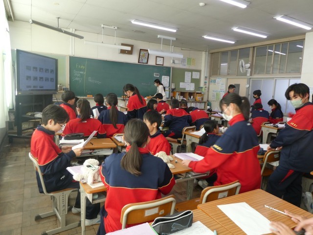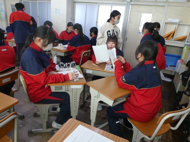 1年生の英語科の授業では、学習したことを使ってスキット(寸劇)をつくっていました。友達と協力して会話文や振り付けなどを考え、発表しました。発表後にはそれぞれの発表のよかったところなどを評価し合いました。小道具も用意されていて、臨場感のあるスキットとなっていました。