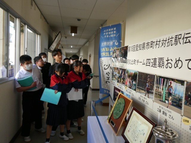 12月に実施された愛知駅伝の4連覇記念パネルや優勝旗、盾などが本校で展示されています。