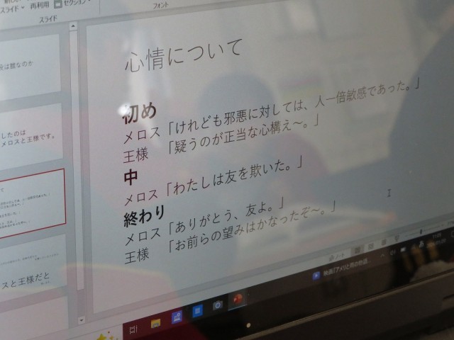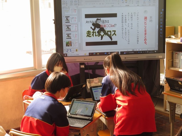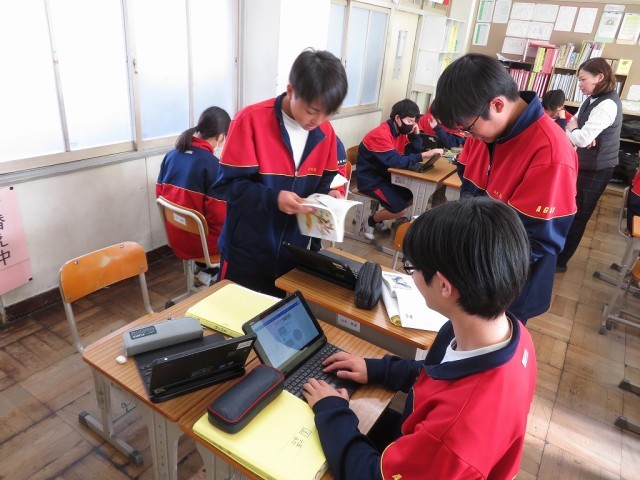 2年生の国語科の授業では、「走れメロス」の読解に取り組んでいます。物語の主題を生徒が考え、パネル制作やプレゼンテーションの準備に励んでいます。グループの仲間と相談し合って不明点を解決したり、新たな工夫を凝らしたりしながら、自分たちの力で主体的に学習を進めることができていました。作品の完成が楽しみです。
