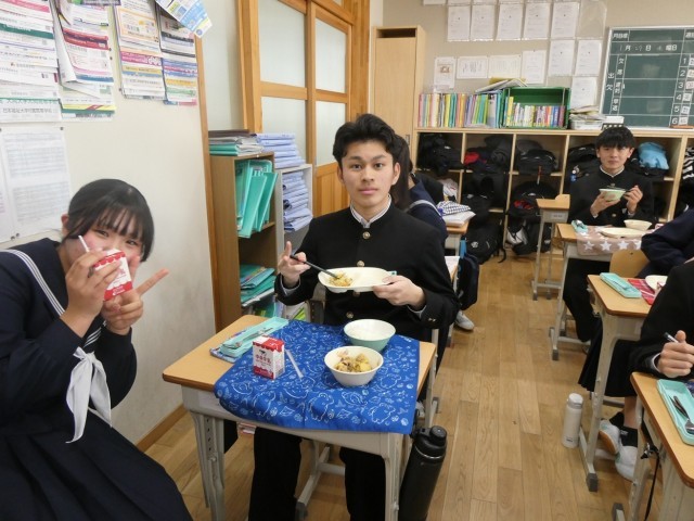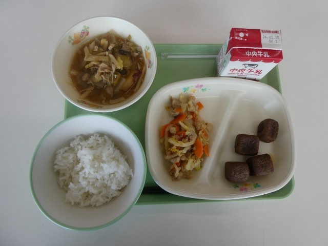 今日の給食は、ご飯、牛乳、めった汁、鶏肉と白菜の治部煮、加賀棒茶の豆乳ドーナツです。今日は、石川県の郷土料理や特産物が提供されました。加賀棒茶は石川県で生産されているほうじ茶で、豆乳が入った優しい味わいのドーナッツにして提供されました。ほんのり甘くておいしかったです。