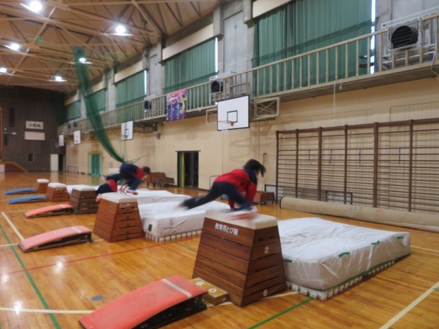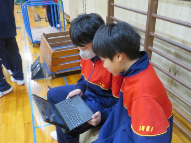 1年生は体育科の授業で、跳び箱に挑戦しています。今日は、「抱え込み跳び」の練習をしました。まずは、自分に合った高さを選んで跳び箱の上に乗るところから徐々に慣れていきました。途中、タブレット端末を活用して自分の姿勢を確認し、ペアでアドバイスをするなどして各自の課題を見付けていました。けがもなく、安全に取り組むことができました、