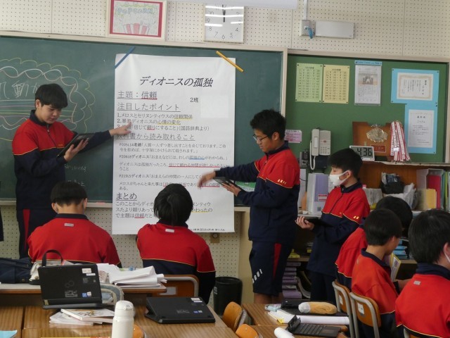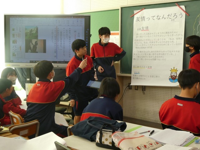 「走れメロス」の主題について、パネルディスカッションを行いました。それぞれのグループが読み取ったことをもとに、主題とその理由を発表し、その後、話し合いを行いました。叙述を根拠に、それぞれの考えを伝え合う姿はすばらしかったです。
