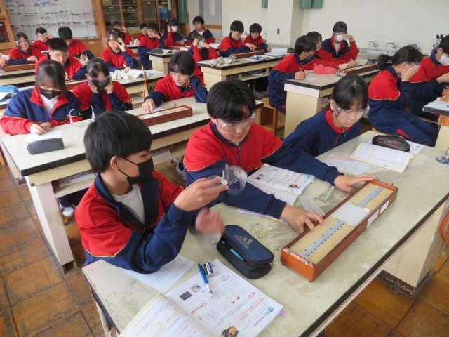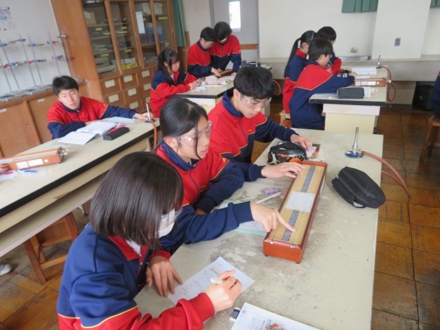 1年生は理科の授業で音について学習しています。今日は、モノコードを使って、弦を弾く強さ、張る強さのちがいによって、音の高さ、大きさ、弦の様子がどのように変化するかを確かめました。一人では見分けづらい音の高さも仲間と確認し合うことでスムーズに実験を進めることができました。