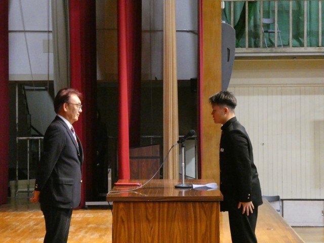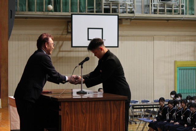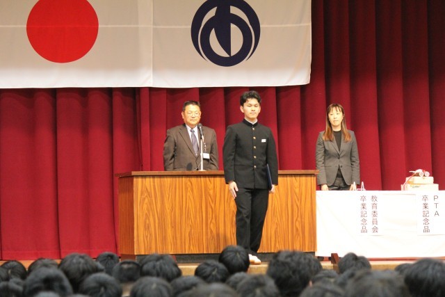 3年生が卒業記念品授与式、同窓会入会式に臨みました。記念品授与式では、代表の生徒が、教育委員会とPTAからの卒業記念品を受け取りました。また、同窓会の入会式では、同窓会長から挨拶と生徒への激励のことばをいただき、代表児童が誓いのことばを述べました。卒業に向けて、意識の高まる式となりました。