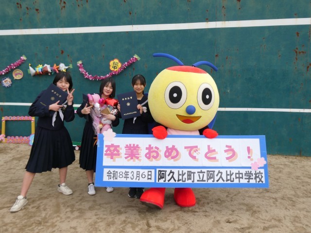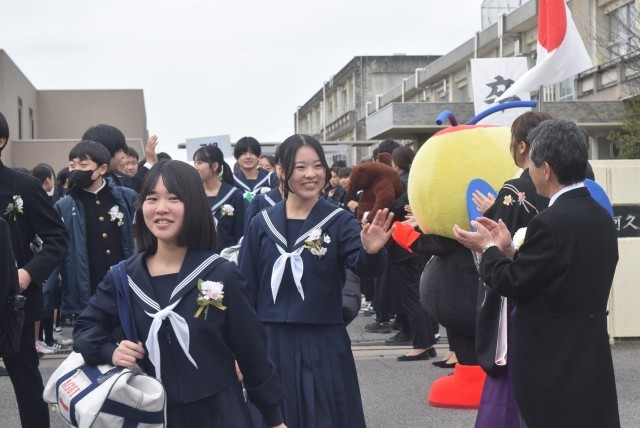 在校生と先生たちが、見送りの花道をつくってくれました。PTAの役員さんやアグピーも一緒に卒業をお祝いしてくれました。