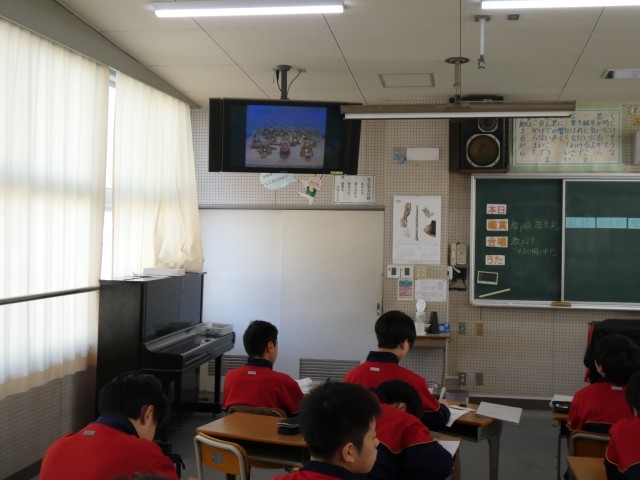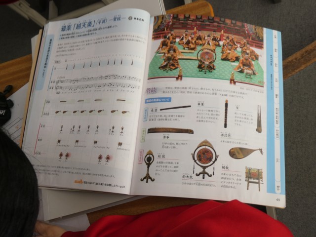 2年生の音楽では、雅楽の鑑賞を行っていました。「越天楽」を聞きながら、使用される楽器の特徴や西洋のオーケストラとの違いなどについてまとめていました。さまざまな楽器から奏でられる音色に親しんでいました。