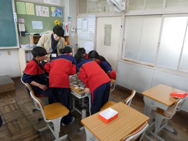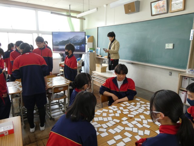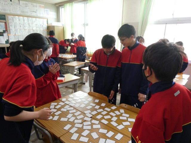 1年生の国語の授業で、百人一首を行っていました。読み札が読まれると、下の句の書かれた取り札をグループの誰よりもはやく取れるように探していました。歴史的仮名遣いで書かれた取り札に苦戦しながらも、一生懸命探して見つけていました。いち早く札を取る子がいると周りの子が拍手をするなど、和やかな雰囲気でかるたを楽しんでいました。