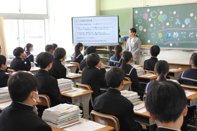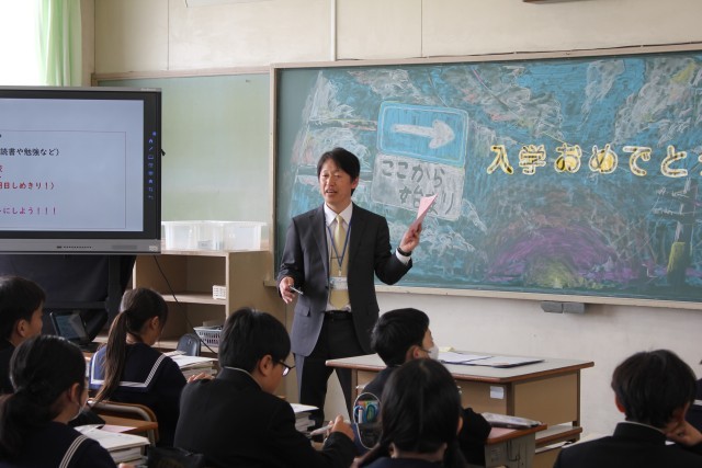 入学式が終わった後は、それぞれ学級へ戻って学級活動を行いました。担任の先生の自己紹介や明日からの予定の確認などをしていました。新しい学級にも早く慣れて充実した中学校生活を送ってほしいと思います。