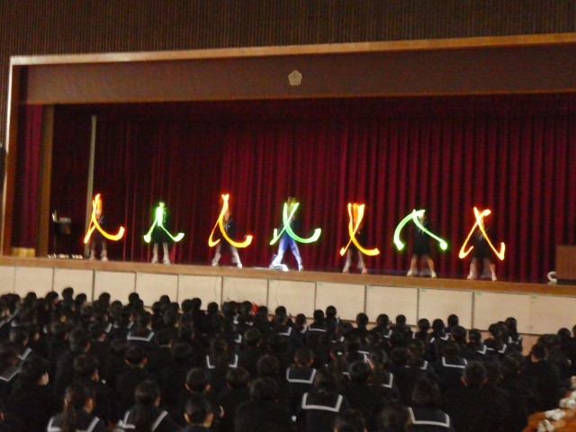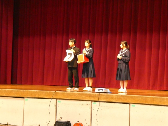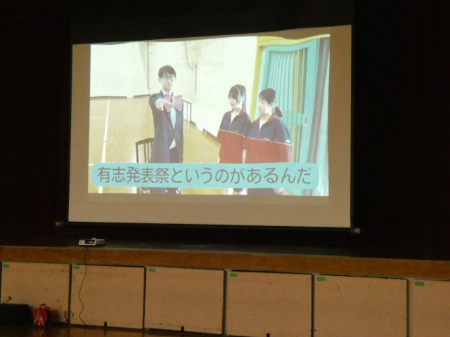 その後、生徒会執行部から、学校の行事やきまりなどの紹介がありました。興味をもってもらえるように、アニメキャラクターに扮したり映像を取り入れたりしながら紹介してくれました。