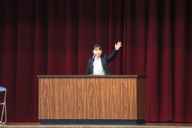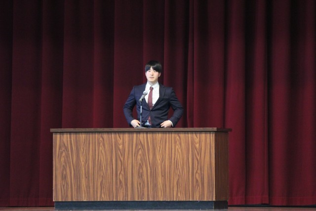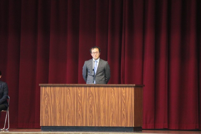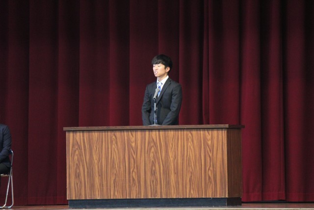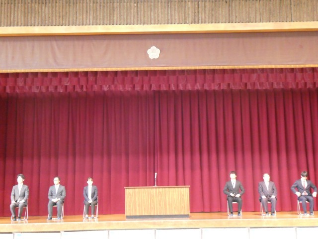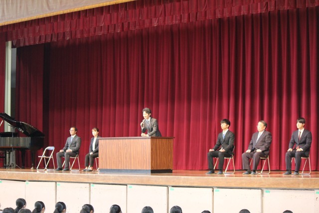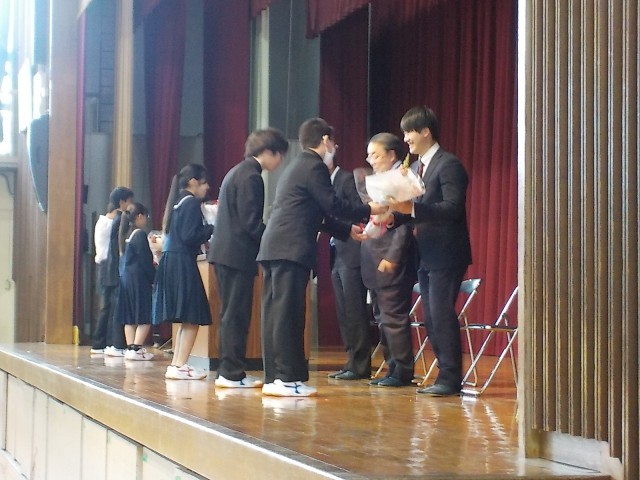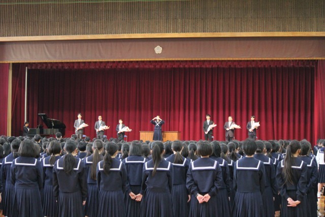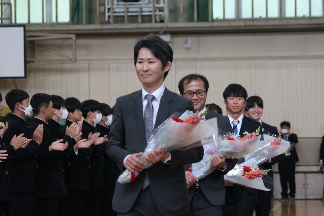 本日、離任式があり、離任された先生方からお言葉をいただきました。最後には、全員で校歌を歌い感謝の気持ちを伝えました。