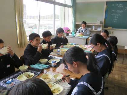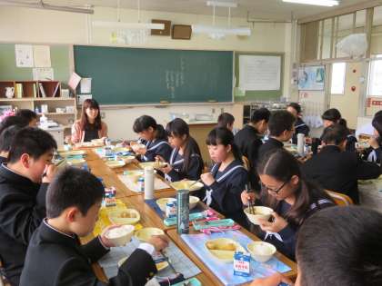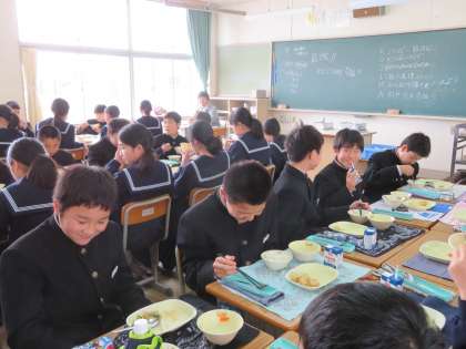 給食の時間は、生徒のほっとできる時間です。会話がはずむと、給食が一段とおいしくなります。中学校に入って、新しい出会いもたくさんあります。こうした出会いを大切にして、一人でも多くの友達ができるといいですね。