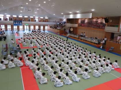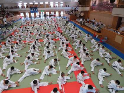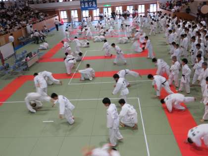 柔道部は、昨日の団体戦に続いて個人戦が開催されました。競技開始前に、一斉に準備運動を行いました。前回り受け身などを次々に選手がする様子は、壮大でした。予定通り10時20分から試合が始まりました。