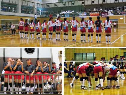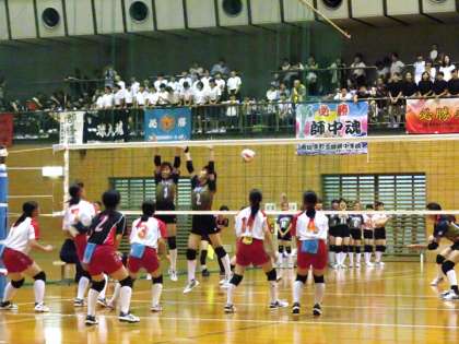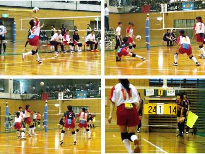 バレーボール部女子の郡大会は、武豊町総合体育館で開催されました。一回戦の相手は富木島中学校で、予定より30分程度遅れてのスタートとなりました。一セット目からサーブ、レシーブ、アタックが順調で25対15で一セット目を先取しました。