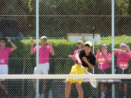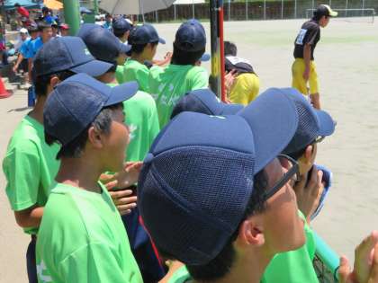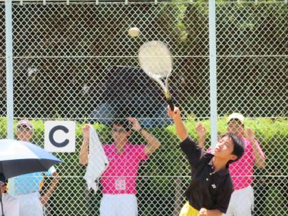 もう一つのペアの試合は、12時近くからの開始となり、猛暑の中での戦いとなりました。三回戦になるとラリーが続くことが試合中に何度もありました。気持ちを切らすことなく粘り強く相手に向かっていく選手が印象的でした。選手の頑張りを励ます応援にも力が入りました。善戦はしましたが、あと一歩及ばす、惜敗となりました。
