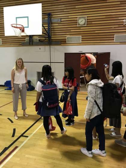その後には、体育館などの校内見学をし、正面玄関で集合写真です。みんな、いい笑顔です。