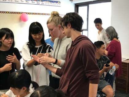 オセロ、将棋、けん玉、ダルマ落とし、あやとりに外国の方たちは興味津々で、それを生徒たちが英語で説明し、実演するという本当に素敵なひと時。