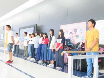 到着ロビーの空いているスペースを利用して、解団式を行いました。代表生徒からのあいさつがありましたが、8日間のカナダでの学びの大きさを感じる堂々とした発表でした。また、会の中では、添乗員の方に感謝の言葉とプレゼントを渡すサプライズもありました。添乗員の方からも個々の生徒にプレゼントがあり、とて温かく和やかな雰囲気で、会が進みました。最後に引率者の先生から、日本文化紹介など、現地で本当に生徒がよく頑張ったことを、私たちに伝えてくださいました。
