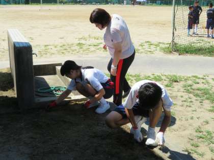19日(日)の除草作業では、参加いただける保護者の皆様方には格別お世話になります。熱中症対策として、給水時間をつくりながら、進めさせていただく予定ですので、どうぞよろしくお願いいたします。全校除草作業に向けて、各部活動では、担当場所の除草を行っています。作業日は、各部活動の予定に従って行っています。今日は、剣道部の部員が、除草を一生懸命にしてくれました。