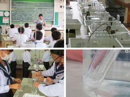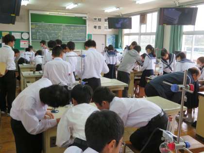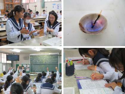3人の生徒で手分けして実験を行い、考察を話し合う活動の中では、学習を深め合う姿も見られました。また、授業最後のふりかえりを通して、学習した内容を確認することもできました。