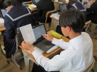 技術・家庭科の単元「生活に生かすものづくりをしよう」で、公開授業を行いました。さしがねの利点を正しく理解して、板材に正確なけがきができることを目標にしました。授業の初めに、聖徳太子がさしがねをもっている絵図を示して興味関心を高めていきました。また、一点を定めるだけで垂直な線を引けることを知り、板材へのけがきを通して、さしがねのよさと便利さに触れることができました。グループ内で確認し合いながら、板材に正確なけがきをしていこうする姿がありました。