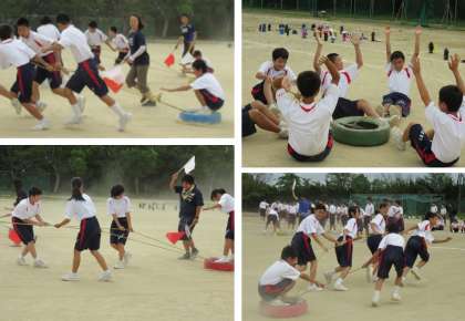 1年生の学年練習は、午後の時間帯を使って行いました。学年種目「タイヤサーフィン」では、クラスで声をかけ合いながら競い合いました。学級大リレーも、次々に順位が変わり、大いに盛り上がりました。練習の中で、1年生も学級の団結がどんどん強まってきています。