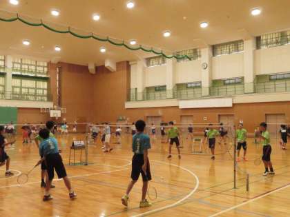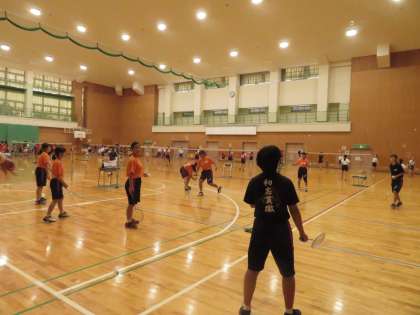 半田市体育大会バドミントン大会が、半田市体育館で開催され、本校から男子・女子が出場しました。この大会は、ダブルス2ペアとシングルスの団体戦を行っていきます。予選リーグでの順位を決定後、1位から3位のリーグ戦を行っていきます。開会式前から、しっかりとアップをして試合に臨みました。