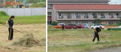 今年度、阿久比町給食センター建設のために、夏休みに西グラウンドの除草作業ができない状況でした。学校祭に向けて、少しでも駐車台数が確保できるように、先週から除草に取りかかっています。今日は、大学生ボランティアの方もお手伝いをしてもらえました。とてもありがたいです。十分な駐車場確保まではいきませんが、どうぞお許しください。