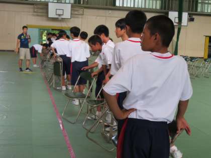 1年生が、学校祭に向けて1・2時間目にシートひきを行い、6時間目にイス並べを行いました。1年生にとっては、中学校で初めての椅子並べとなります。担当の先生から指示を受けながら作業を進めていきます。縦の規準となる椅子を事前に並べておき、カラーテープを使って横がしっかり揃うように並べていきます。いつも他学年に準備をしてもらっていた1年生。改めて事前の準備のたいへんさを学ぶ機会にもなりました。