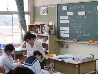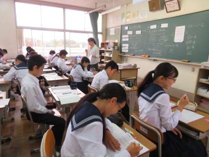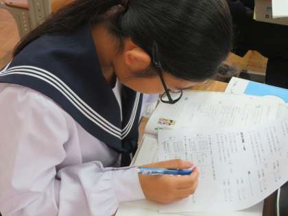 1年生数学では、方程式の活用の領域に入りました。本日の課題は「過不足の問題」。足りない、余っているという言葉がキーワードとなって、+か−なのかを使い分けていきます。ヒントとなる図も準備されていて、思考の助けとなっています。この図をみながら、過不足にかかわる問題の見方・考え方を学んでいきます。