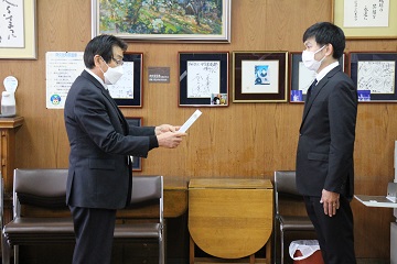 本来ならば町の先生たちが集まる現職教育発表会で、多くの先生たちの前で表彰されるはずでしたが、発表会は中止となってしまいました。今日は教育長様に来校していただき、直々に賞状を受け取ることができました。