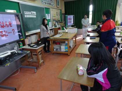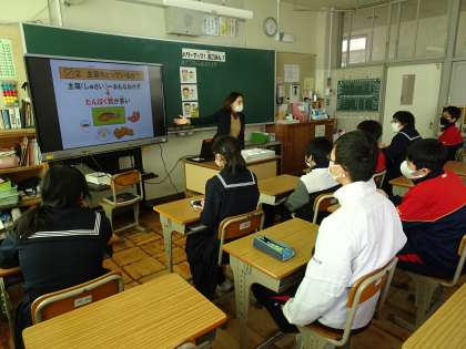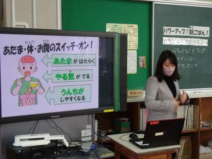 「パワーアップ朝ごはん」をテーマに、朝ご飯の必要性を、健康の面から説明していただきました。食事の調査から、小学生と比べ、中学生は朝ご飯を食べてこない生徒もいるので、しっかり朝食をとることの大切さがよくわかりました。