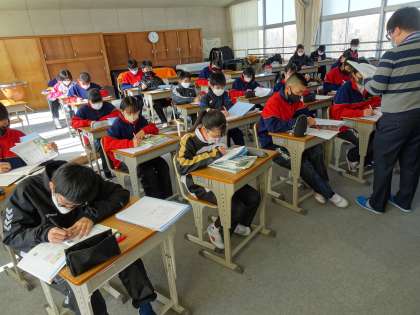 コロナの感染予防から、音楽は、歌を歌ったり、アルトリコーダー等の楽器の演奏を控えていますので、今日も飛沫の心配のないリズム打ちのテストをやっていました。テストを待っている生徒は、学年末テストも近いことからプリント学習をしていました。