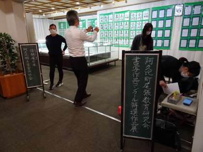 阿久比町尾張教育研究会書写コンクールの特選作品が、明日2月10日(木)〜2月27日(日)まで、阿久比町立図書館で開催されます。今日は、町内の小中学校の書写担当の先生方が、図書館に集まり、展示の準備をしてくださいました。