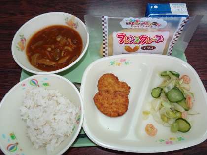 本日の給食は、牛乳、麦ご飯、ハヤシライス、大豆ナゲット、シーフードサラダ、チョコクレープでした。今日はバレンタインデーだから、チョコクレープだったのですね。今気づきました。
