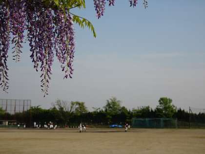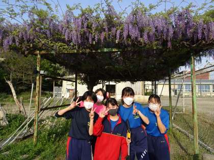 運動場にある藤棚の藤が、満開となっていましたので写真を撮ろうとしましたら、生徒に見つかり、記念写真撮影となりました。阿中には美しい花がたくさん咲いていますので、心が和みます。