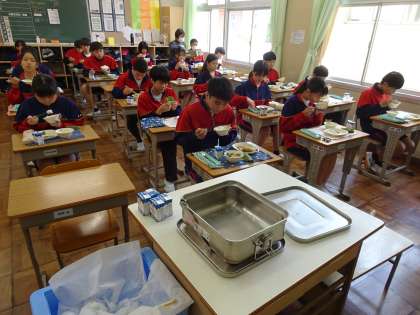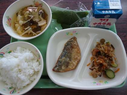 本日の給食は、牛乳、ご飯、若竹汁、あじの竜田揚げ、ふき入りちらし寿司、柏餅でした。柏餅、さすがの人気です。じゃんけんをしている学級が多かったです。