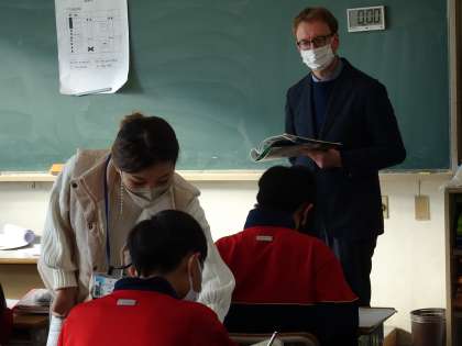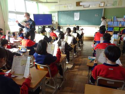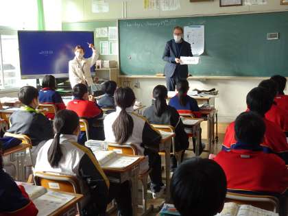 今日もALTの先生とのTTの授業を参観しました。ALTの先生がまず新出の単語や慣用句を読み上げ、生徒はあとに続いて発音します。その後、「Let'sTalk3道案内」の文章を読みながら、生徒があとに続くという内容ですが、この授業を観て思うことは、 ALTの先生は、生徒が読むと、必ずNiceと言ってくれることです。もちろん発音が正しくないと繰り返して直してくれます。また、教室内をまわりながら、身振り手振りで、発音の高低なども示してくれます。生徒のやる気を一生懸命引き出そうとしている姿は、他の先生たちもお手本にすべきところかなと思いました。もう一人の先生も、身振り手振りで、ALTの先生と息ぴったりで授業をされていました。とても楽しい授業でした。